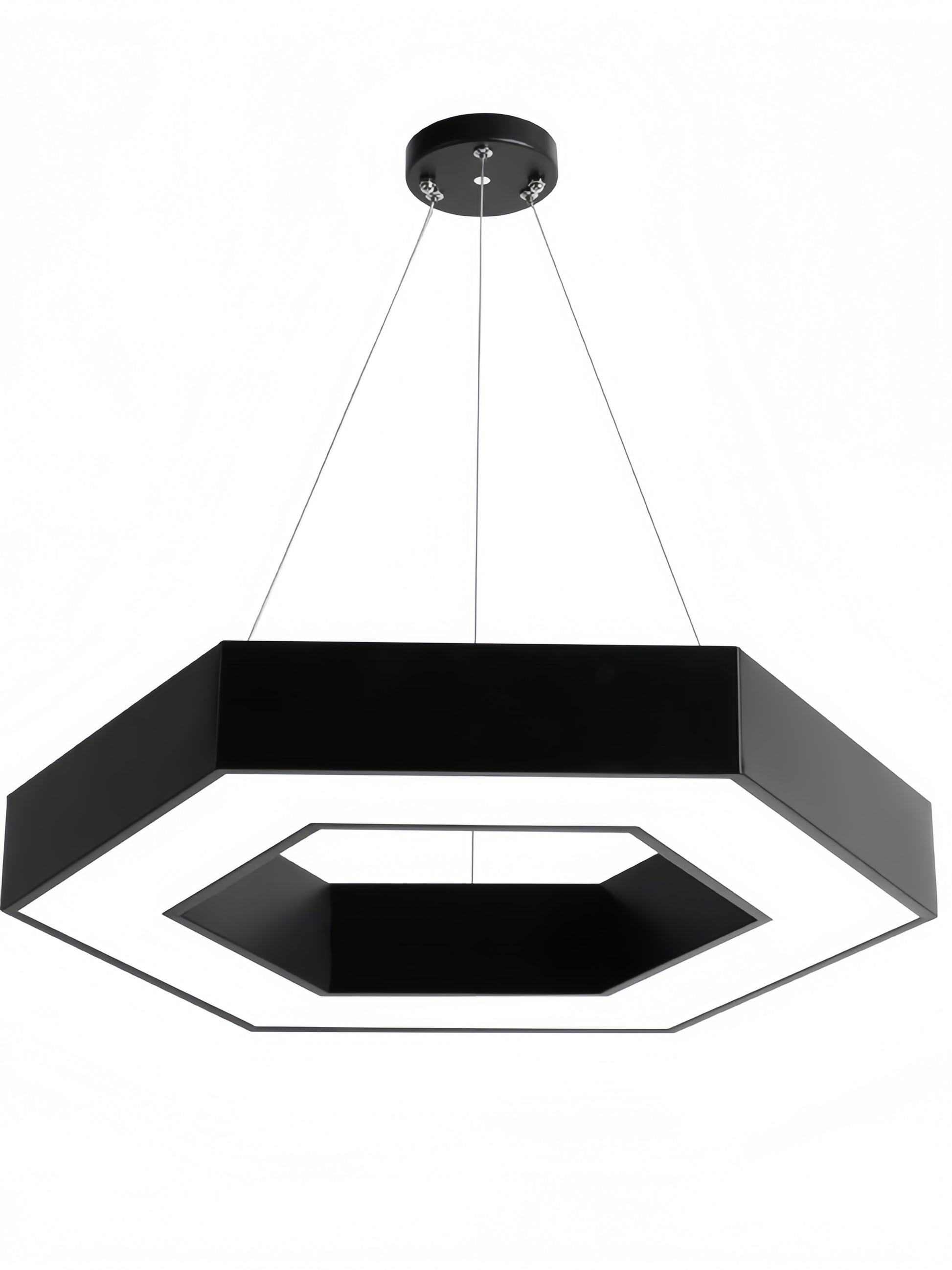 La Lámpara Colgante LED de 72W, con estructura hexagonal en acabado negro mate, combina diseño moderno y alto rendimiento lumínico para espacios contemporáneos como oficinas, salas de juntas, recepciones, showrooms o interiores residenciales con estilo.