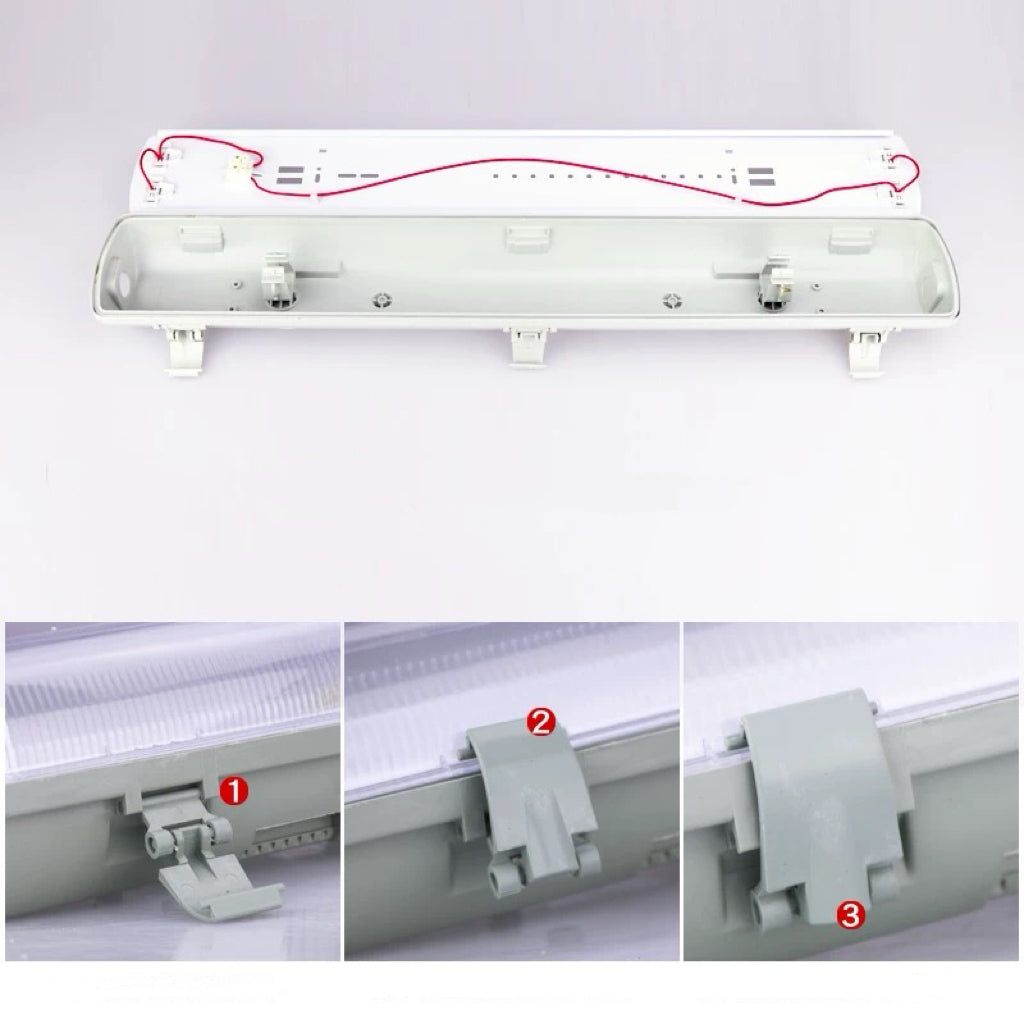 Estructura resistente y sellada, fabricada en policarbonato, diseñada para proteger los tubos (no incluidos) contra humedad, polvo y salpicaduras.